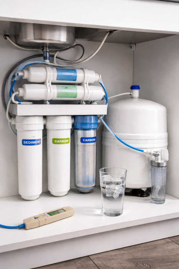 Die weitere Internetrecherche führte mich zur Umkehrosmoseanlage. Wie oben erwähnt kommt hier nahezu destilliertes Wasser heraus – also eigentlich genau das, was ich brauche.