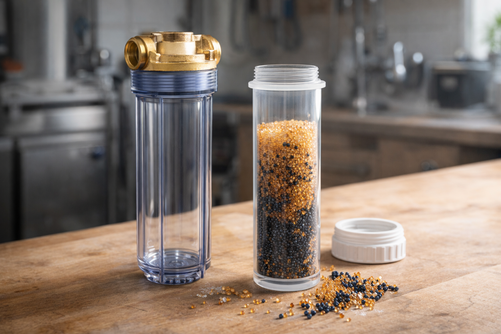 Mit Mischbettharz zur Vollentsalzung, einem Filtergehäuse und einer geeigneten, selbst befüllbaren Kartusche nahezu destilliertes Wasser herstellen – und dieses anschließend gezielt aufsalzen.