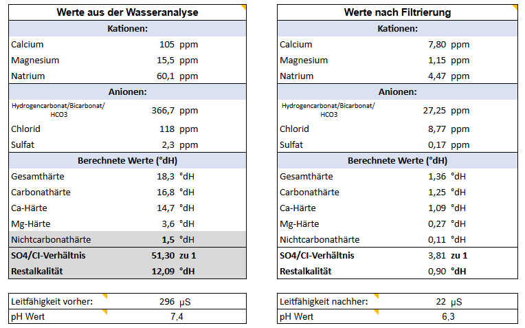 Die im Wasser enthaltenen Bestandteile müssen sich entsprechend des Unterschieds der Leitfähigkeit zwischen ungefiltertem und gefiltertem Wasser anteilig reduziert haben. Genau diesen Unterschied machen wir uns zunutze, um die Werte nachvollziehbar anzupassen.