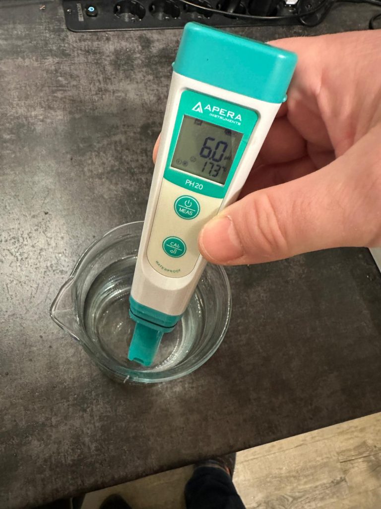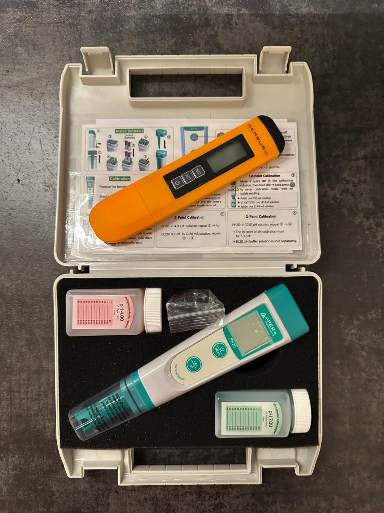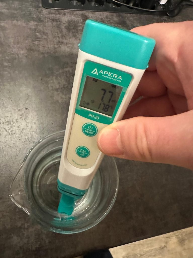 Ein pH Meter, welches den Messbereich von 0 – 14 abdeckt, eine Temperaturkompensation hat (ATC – wichtig!) und selbst mittels Kalibrierflüssigkeiten kalibrierbar ist