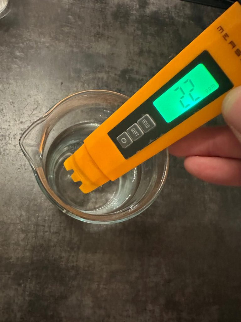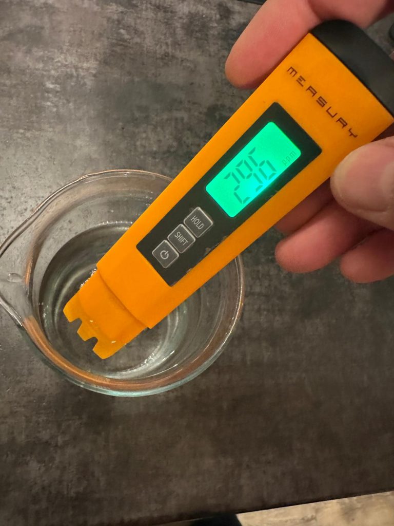 Ein weiteres nützliches Werkzeug sind Messgeräte zur Leitfähigkeitsmessung (TDS-Meter)*. Sie zeigen dir, wie viele gelöste Stoffe sich im Wasser befinden, und sind besonders praktisch, wenn du mit Umkehrosmosewasser oder Wasserfiltern arbeitest. Zwar sagen sie nichts über einzelne Mineralien aus, aber sie helfen dir zu beurteilen, wie „rein“ dein Wasser ist. Da ich dieses Gerät selbst verwende, folgt weiter unten etwas mehr mehr Information dazu.